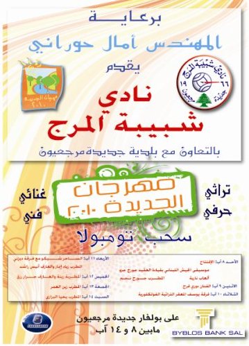 Mahrajan Al Jdeida 2010 Under the patronage of Mayor Amal Hourani and in association with Jdeidet Marjeyoun Municipal Council Sunday August 8 to Saturday August 14, 2010Opening Night at 7:00 PM