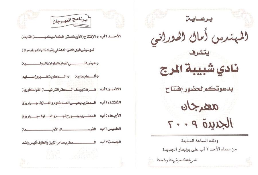 Mr. Amal Hourani Nadi Shabeebat Al Marj cordially invites you to the opening of Jdeida Festival 2009 Sunday August 2, 2009 at 7:00 pm Duration of festival: August 2 - August 7
